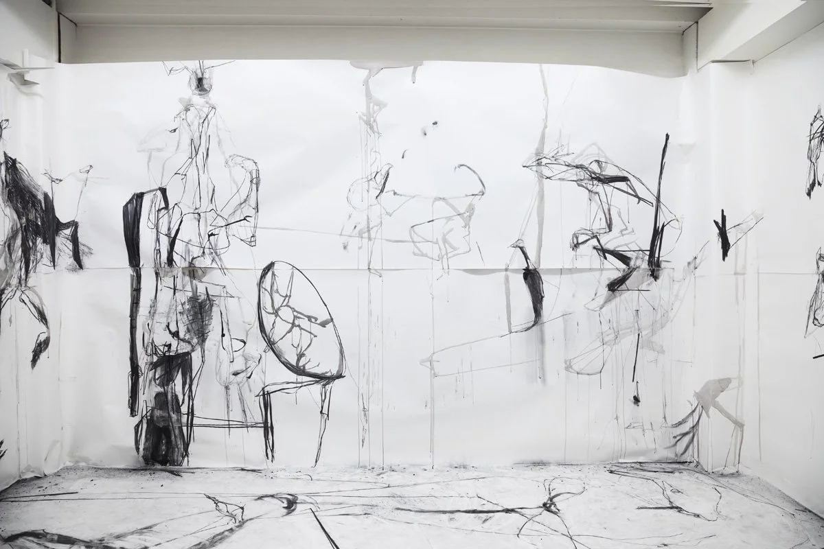 Linien sind für mich autonome Entitäten. Jede einzelne ist auf der Suche nach etwas, was sie darstellen könnte. Manchmal scheint es mir, als stiegen Urwesen aus dem Unterbewussten aufs Papier, und alle stehen sie zueinander in einer Beziehung. Man denke an Fütterung, Liebkosung, Angriff, Verwundung, an Wachstum oder Umwandlung. Im Laufe der Zeit sind meine Zeichnungen immer grösser geworden, und eines Tages bot ein Blatt Papier den Linien nicht mehr genügend Raum, sich zu entfalten. Ich fing an, in Räumen zu zeichnen, die vollständig mit Papier bedeckt sind. Diese Zeichnungsinstallationen sind mit Kohle und Tusche bezeichnete Räume, die man betreten kann. Man ist umgeben von der Zeichnung und steht auf der Zeichnung. Als Betrachter ist man selbst Teil der Zeichnung.