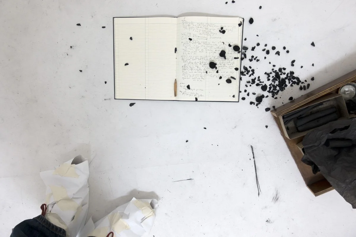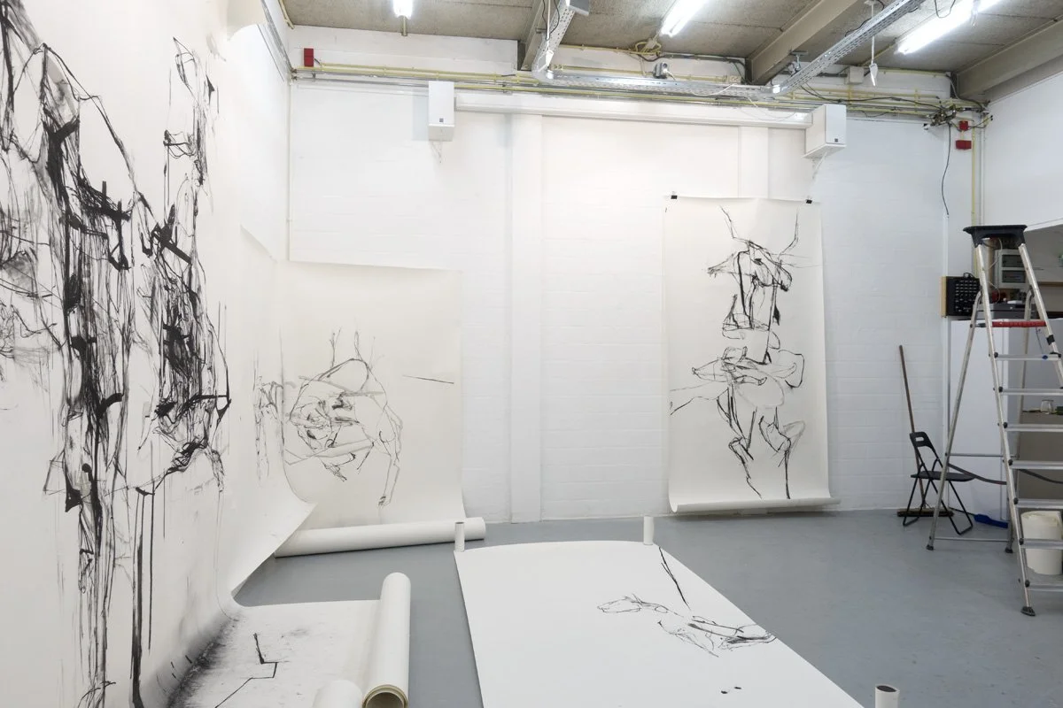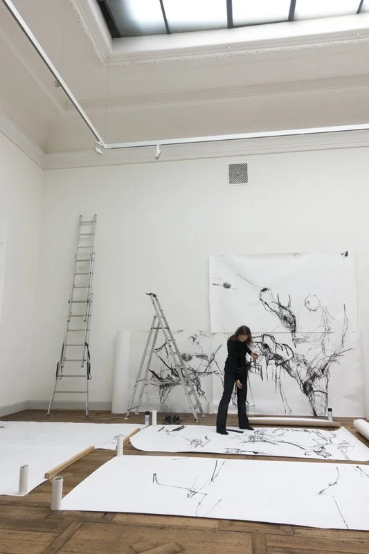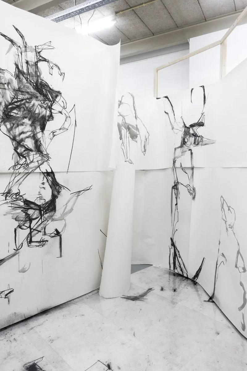 A single sheet of paper no longer gave enough space for the lines of my drawings to unfold. Opening rolls of paper I covered the walls and floor of the studio and the lines grew in volume.